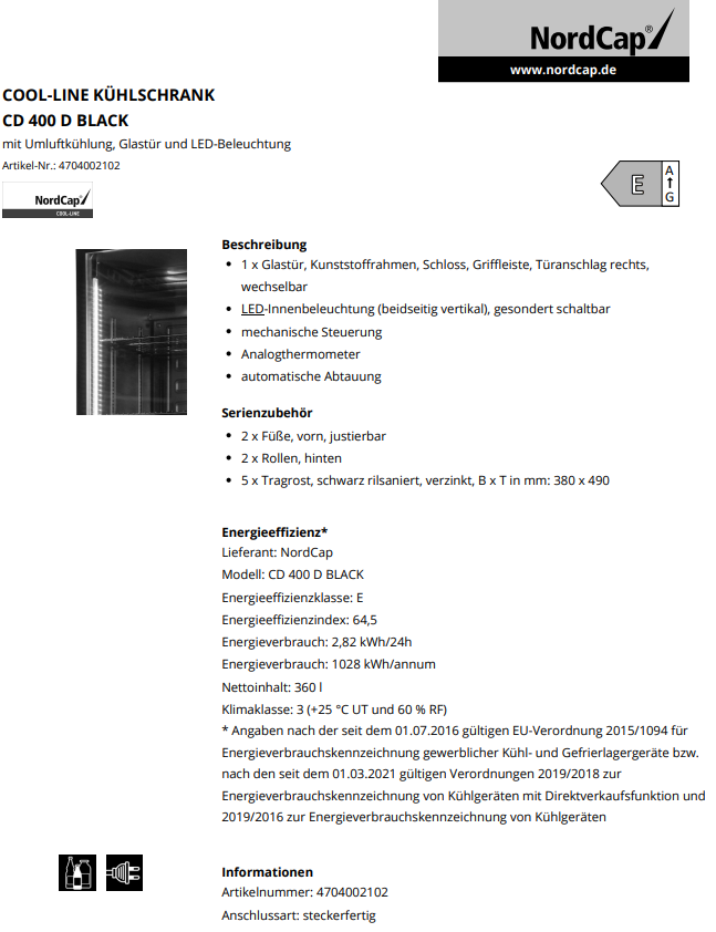 Nordcap COOL-LINE Kühlschrank CD 400 D Black, mit Umluftkühlung, Glastür und LED-Beleuchtung