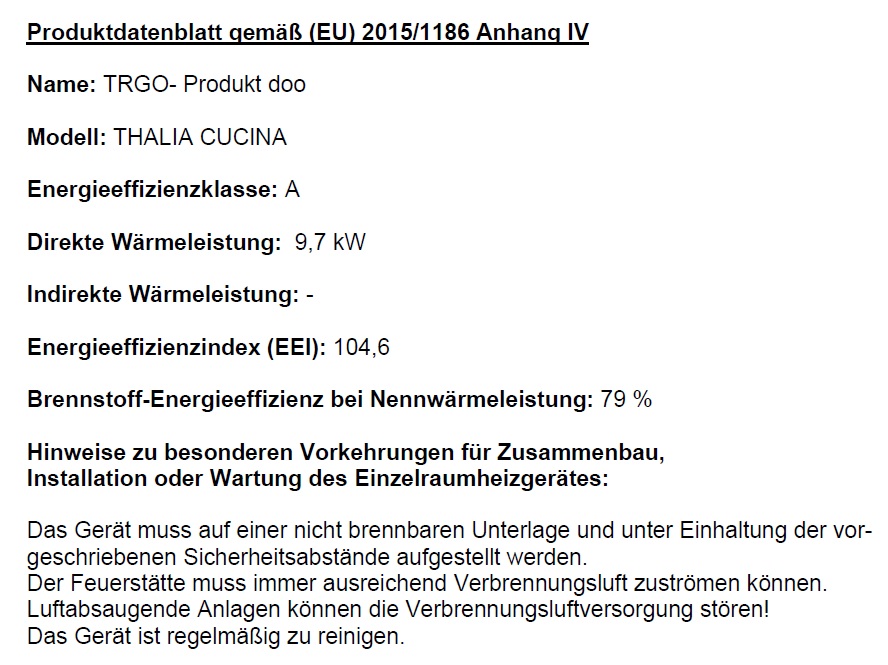 Der Kamin besitzt keine selbstschließende Tür (Bauart 2), sodass es den deutschen Bestimmungen nach nötig ist, einen eigenen Schornsteinzug zur Verfügung zu stellen oder eine Schornsteinberechnung durchzuführen.