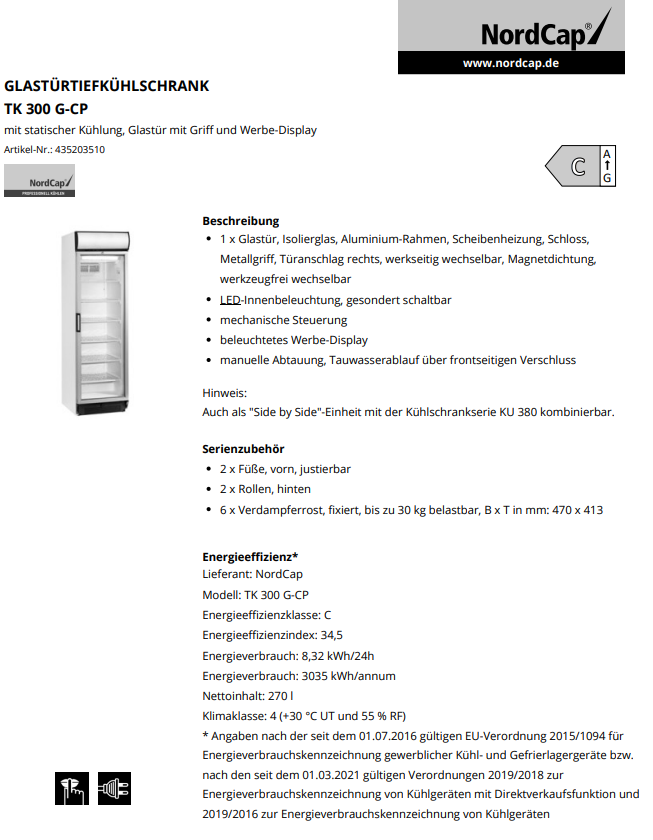 Nordcap Glastürtiefkühlschrank TK 300 G-CP, mit statischer Kühlung, Glastür und Griff und Webe-Display